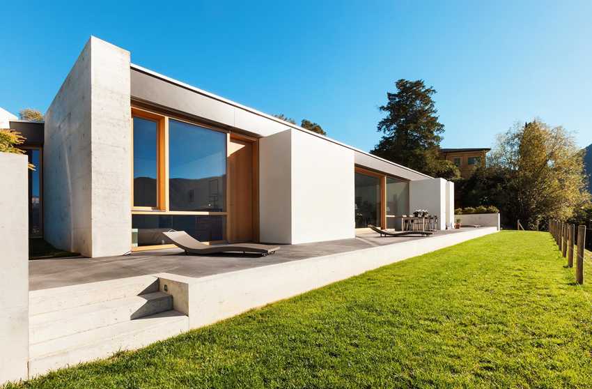 - Отсутствие ограничений при выборе материалов для строительства. При возведении коттеджей в современном стиле допустимо применять новейшие металлические и стеклянные материалы, а также возможно комбинировать фасад из железобетона, блоков и дерева.