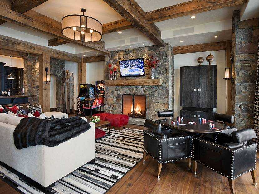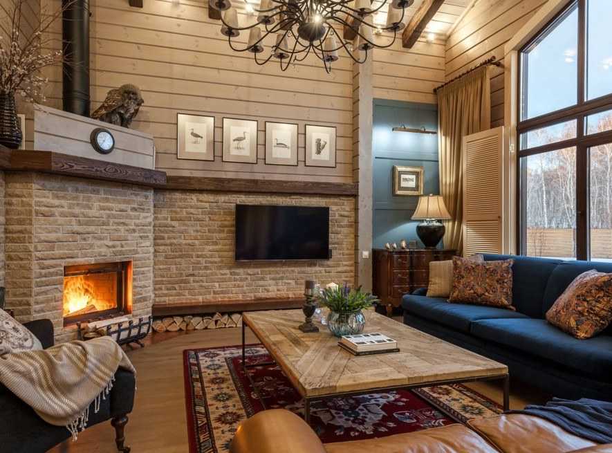 Уютная комбинация стилей шале и кантри в оформлении гостинойИсточник paydaydcr.com