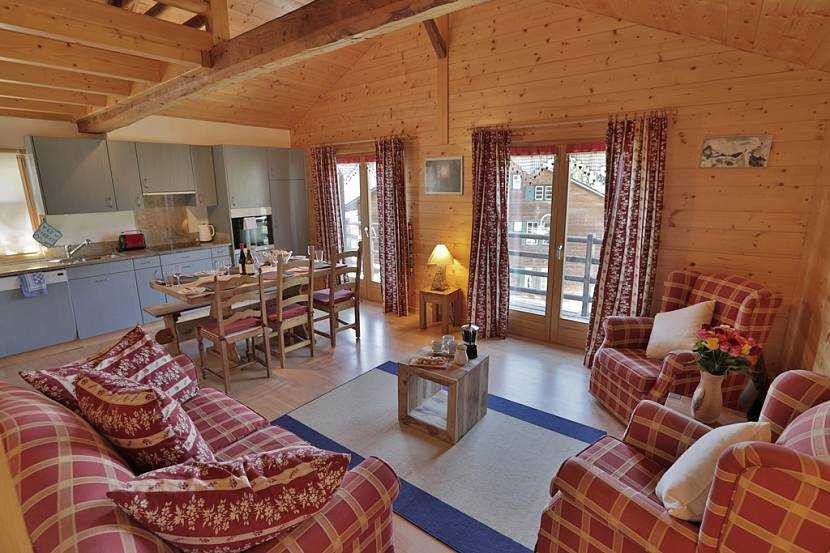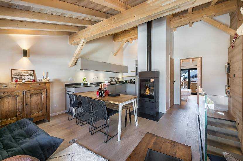 Потолки высокие, деревянные. Потолочные балки чудесно передают атмосферу альпийского дома, хотя в современном варианте являются частью декора (в мансарде открытые балки — часть стропильной системы крыши).