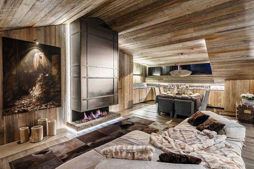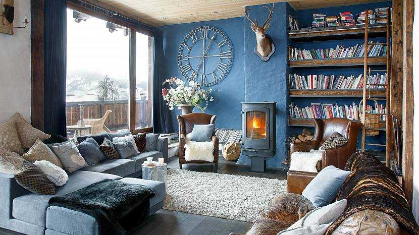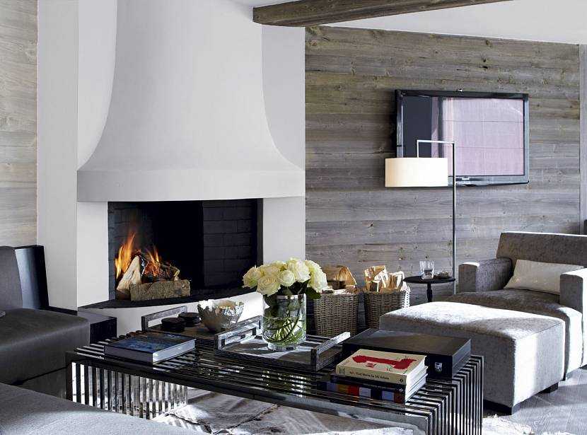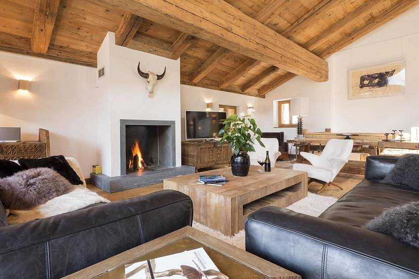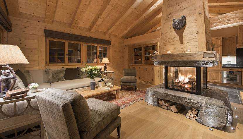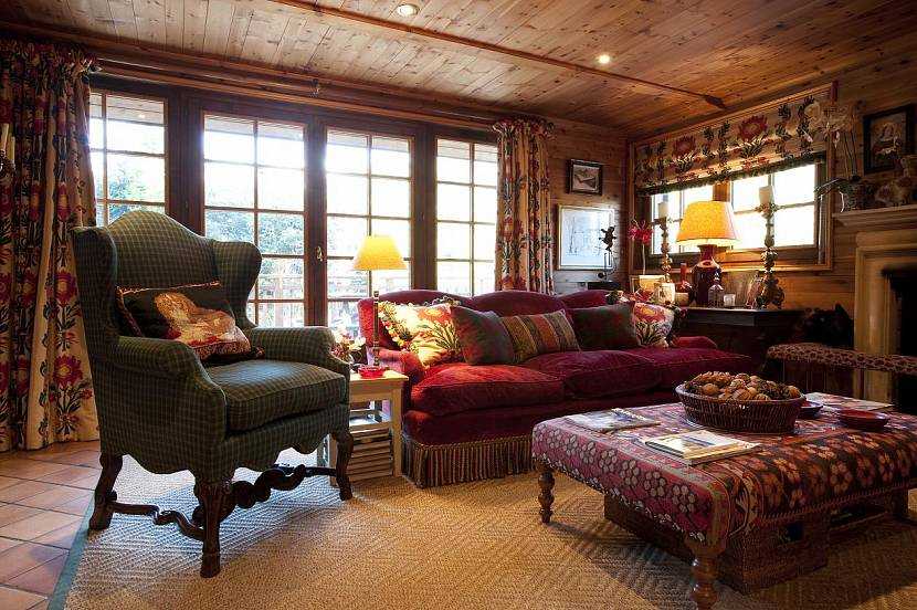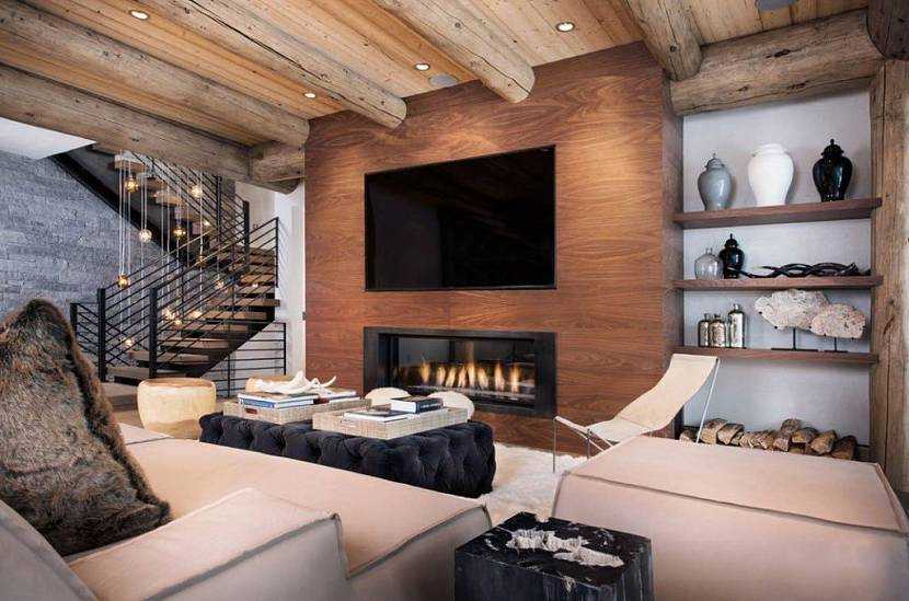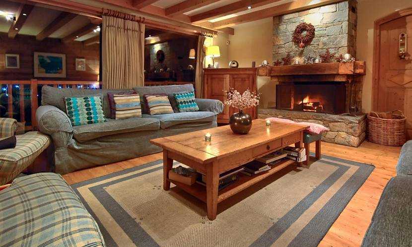 В интерьерах используются простые геометрические формы, без сложных асимметричных конструкций и витиеватых элементов. Стилистика шале скорее напоминает смесь деревенского и классического стилей. В гостиной обязательно устанавливают камин, желательно – большой и настоящий.