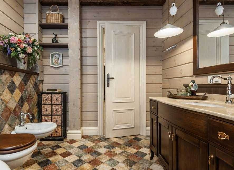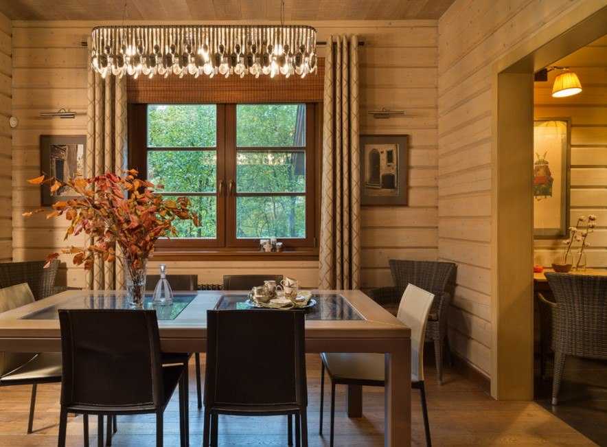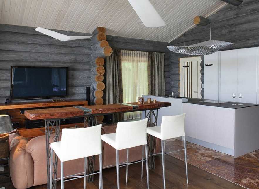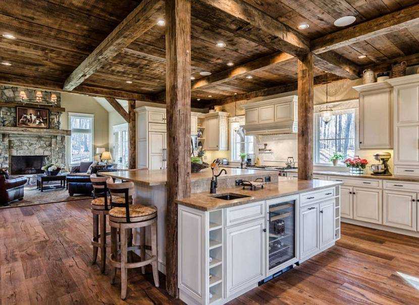 Дизайн приветствует оформление стен и полов древесиной. Балки потолка оставляют открытыми – это изюминка интерьера. Мебель подбирают в спокойных светлых тонах, стараясь сохранять максимальную естественность и простоту.