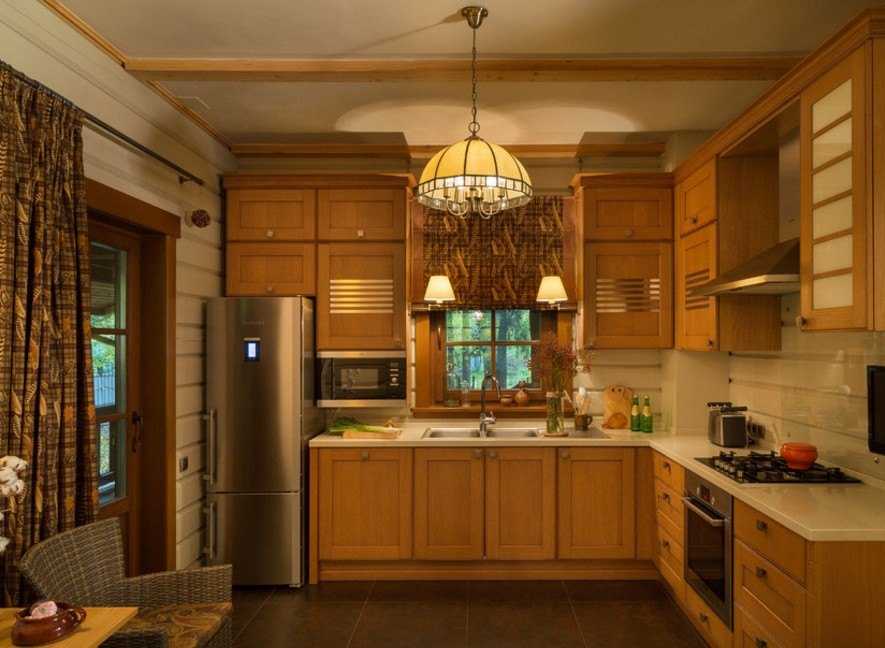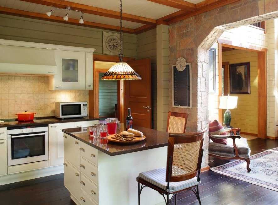 Бытовая техника смотрится вполне органично на фоне кухонного гарнитура и стен, отделанных деревом, поэтому скрывать ее за фасадами совсем не обязательно. Единственное ограничение в выборе плиты или холодильника состоит в рекомендации избегать белых моделей.