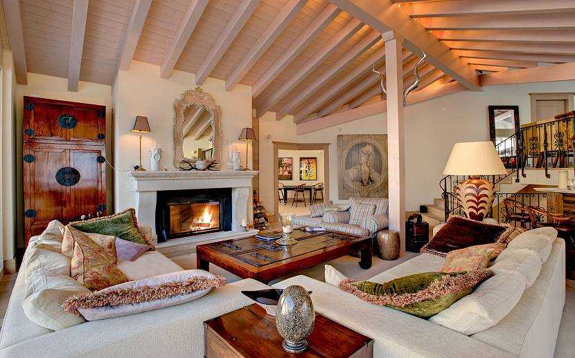 Камин — визитная карточка стиля, место фокусировки интерьера. Он устанавливается в гостиной, а то и в спальне, облицовывается камнем. Встречаются электрические камины, над которыми вполне естественно выглядят плазменные телевизоры.