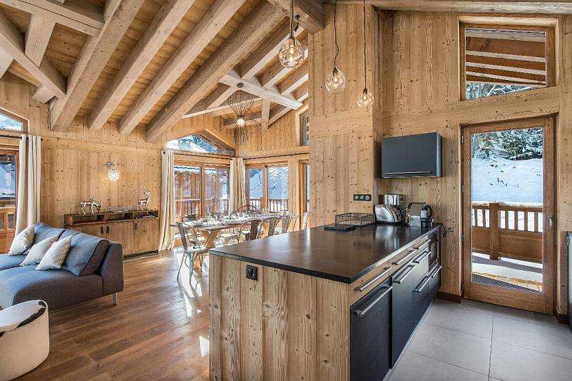 Объединение нескольких пространств в одно (когда кухня совмещается с гостиной) — характерная черта стиля, и подобное решение больше подходит для загородного дома. Такая кухня-гостиная в стиле шале зонируется при помощи предметов мебели, света или различной по цвету и текстуре отделки.