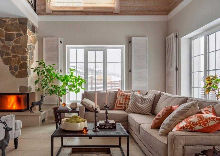 Истоки стиля лежат в простой деревенской жизни, поэтому в гостиной всегда уместен домотканый текстиль, ковры и покрывала ручной работы с этническими мотивами. Классическим же декором считаются шкуры и диванные подушки, которые могут играть роль акцента.