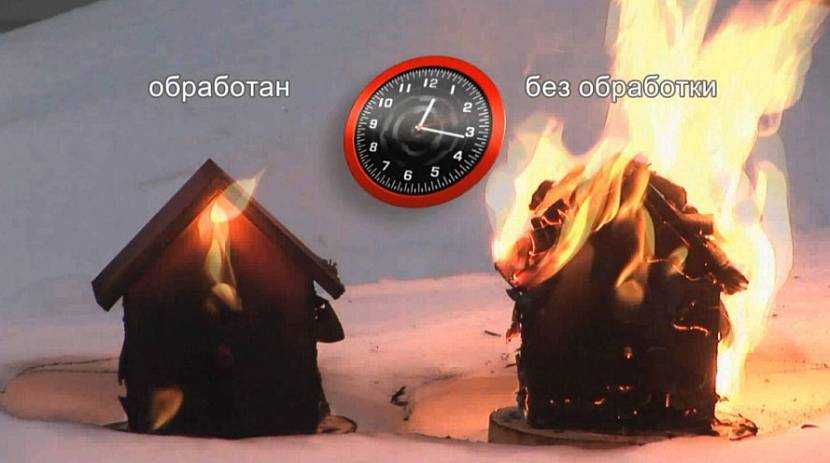 Обработанная древесина все равно горит, но при этом загорается она гораздо неохотнее и медленно сгораетИсточник pozharanet.com