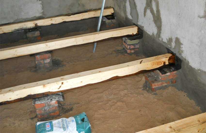 Лаги чернового пола устанавливаются одновременно с нижним венцом, путём врезания лаги в первый ряд бруса. При значительной площади дома, под длинными лагами необходимо формировать опоры – бетонные или кирпичные подставки, которые будут поддерживать лаги по длине.