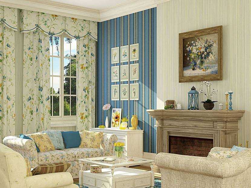 В качестве декора в интерьере используют глиняные или стеклянные вазы наполненные цветами, керамические и фарфоровые фигурки, диван заполняют разнообразные подушки. Основным акцентом зала станет фальш-камин у одной из стен, он может быть выполнен в цвет стен или классического для прованса белого оттенка.
