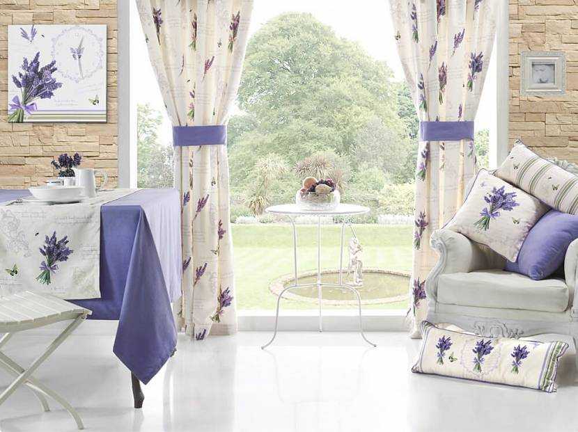 Отличительной чертой прованса является обилие в интерьере ткани. Кроме привычных штор, подушек и пледов, широко используют скатерти, салфетки, мягкие сидения на стулья, ковровые дорожки с узорами в клетку, полоску или с растительным орнаментом. Все они должны быть пастельных оттенков. Для окон гостиных и спален выбирают воздушный тюль, а в пару к нему берут более плотную ткань для портьер, которую собирают симпатичными подхватами.