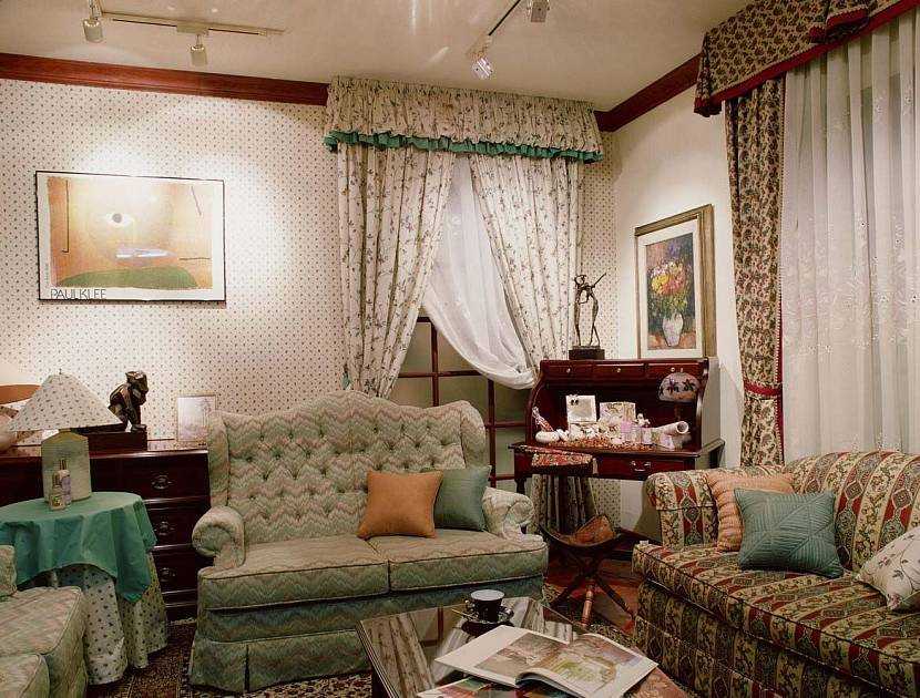 Иногда окна были украшены нежными занавесями, которые легко пропускали потоки воздуха и света. Отдавая дань традициям, для оформления интерьера дома лучше выбрать занавески в стиле прованс, изготовленные из невесомого тюля, атласа или ситца с мелким цветочным орнаментом.