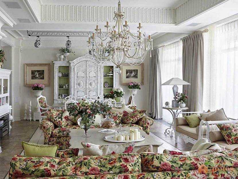 Гостиная в стиле прованс максимально наполнена естественным светом. Большие открытые окна пропускают солнечные лучи и озаряют комнату уютом. Стены отделывают штукатуркой или небрежной кирпичной кладкой, выкрашенной в белый цвет, полы покрывает паркет, камень или беленое дерево. Потолок могут украшать деревянные балки или лепнины.