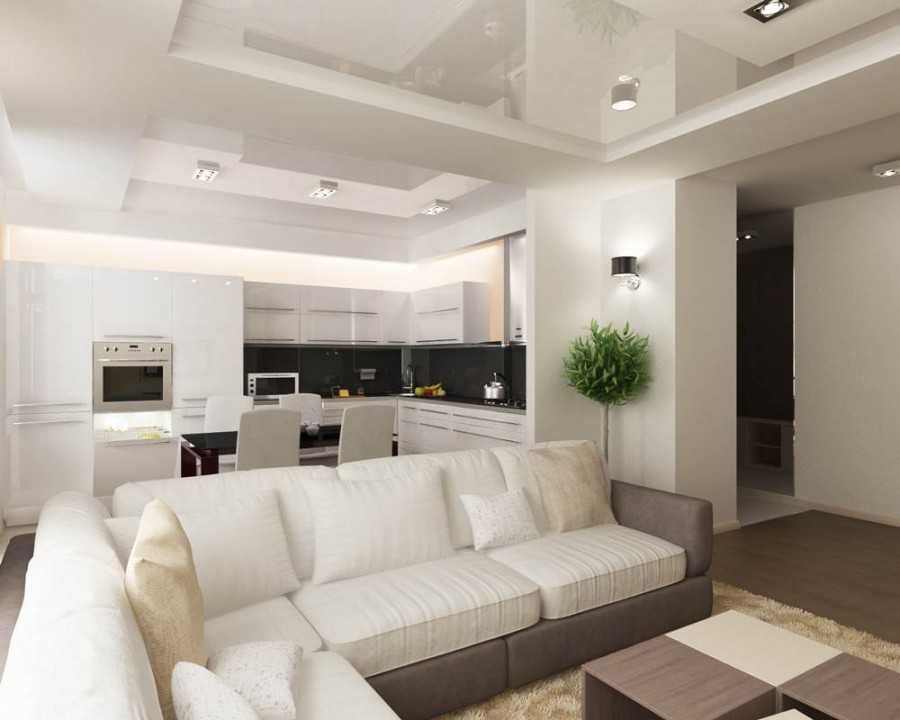 Гипсокартонные конструкции в сочетании с натяжным потолком дают эффект зонирования