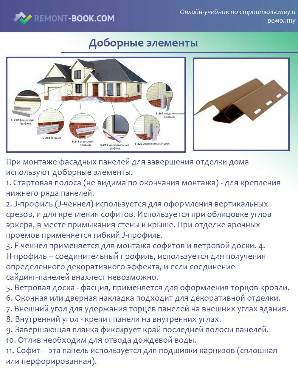 Также вместо стартовой планки можно применять j-профиль. Он позволяет создать своеобразный бортик на стене дома. Эту же планку можно взять для отделки внутренних углов.