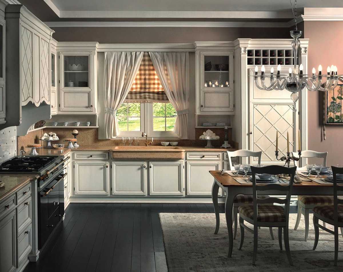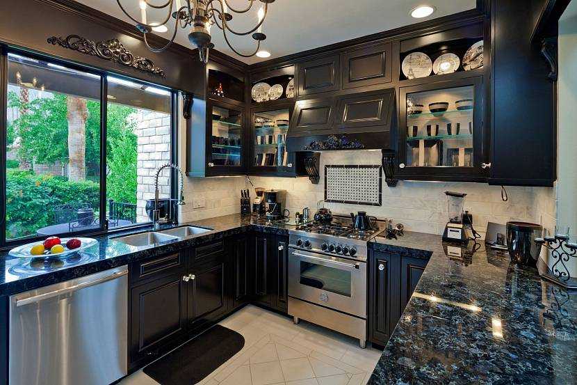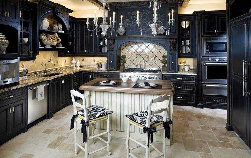 В представленном варианте в помещении установили громоздкий кухонный гарнитур чёрного цвета с резными элементами, для отделки кухонного фартука использовали бежевую плитку. В верхнем ряду шкафа сделали вставки с открытыми полками для размещения декора и кухонной утвари. Оригинальной конструкцией оформили зону возле газовой плиты. В центре установили стол-остров светлого оттенка, над обеденной зоной разместили две массивные белые люстры.