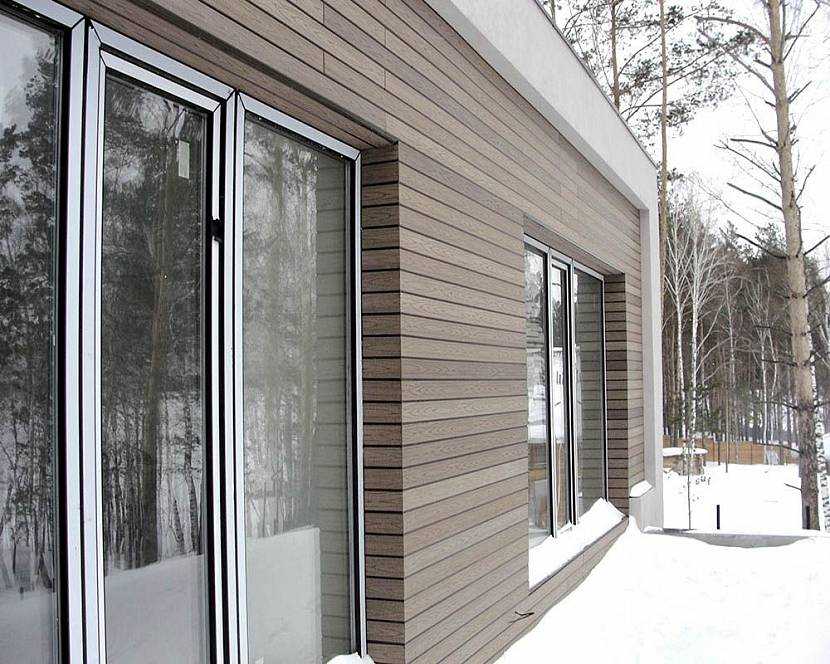 Обшивка фасада дома не требует работ с цементным раствором, материал монтируется при помощи крепежа, поэтому может производиться в любое время года