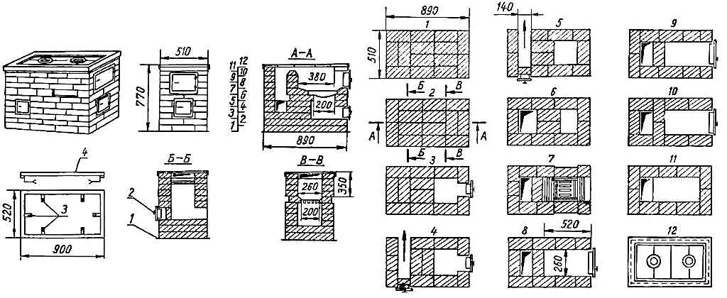 Варочный настил из чугуна имеет отверстие, закрывающееся диском и кругом. В продаже есть и сплошные настилы. В нише для духовой камеры располагают металлическую духовку или водогрейный бачок с краном. Если нишу оставляют свободной, она служит для просушки вещей. Для возведения печки понадобится: