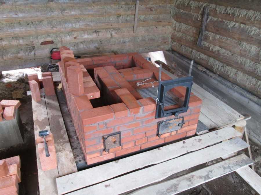 Первый ряд ставят на слой глиняного раствора (4-5 мм). Выровняв основание по уровню, выкладывают второй, оставляя место для поддувальной дверки.