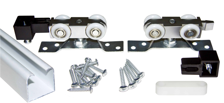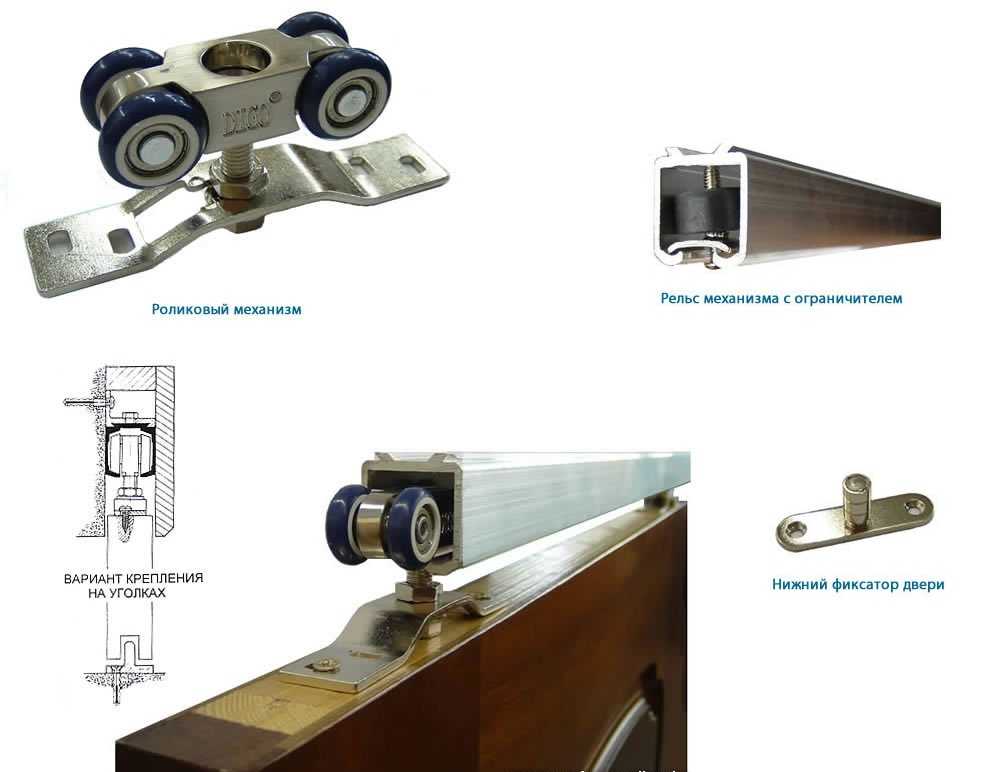 После закрепления бруса с рельсом над входным проемом можно подвешивать дверное полотно. Для этого ролики вставляются в рельс, после чего его края блокируются прижимными винтами. А на половом основании монтируется флажковый ролик, чтобы предупредить отклонение двери по вертикали. На этом этапе можно считать установку раздвижной конструкции завершенной.