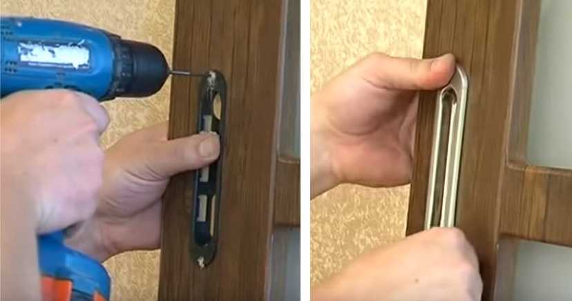 Если же полотно и фурнитура приобретались отдельно, тогда все необходимые выемки и отверстия необходимо выполнять самостоятельно с помощью стамески и электродрели. При этом обязательно делается предварительная разметка участков фиксации элементов фурнитуры.