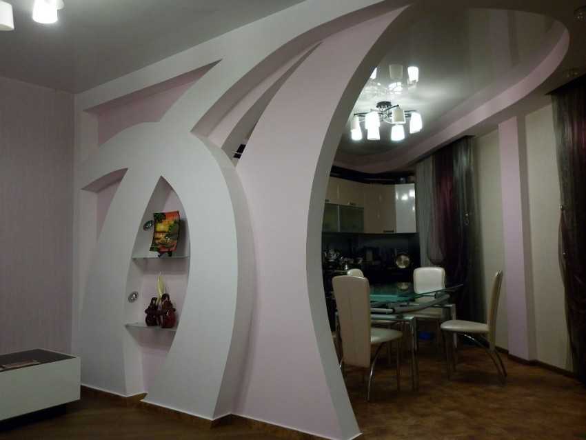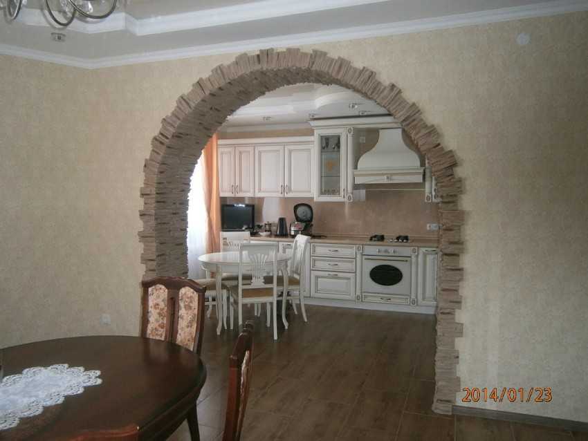 Неширокие дверные проемы на кухне или в прихожей можно оформить резными арками из гипсокартона, аркой волной из гипсокартона или полуаркой, имеющей неправильную ассиметричную форму. Свод этой арки может иметь любую конфигурацию. Такой вариант требует меньшего количества материалов, поэтому считается более экономным.
