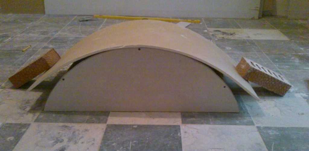 1. Сухой способ подходит только для простых форм и больших радиусов. Он полностью базируется на естественной пластичности и гибкости листа. Но если перестараться – гипсокартон просто переломится пополам. Для работы обязательно нужен каркас. Тянуть плиту можно только вдоль.