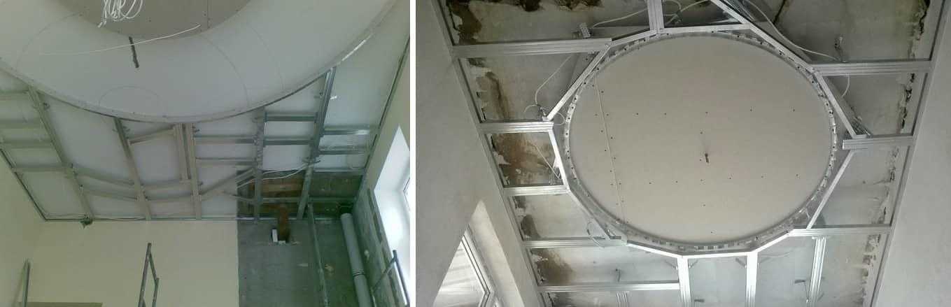 Многоуровневый потолок весь обшивается гипсокартоном, поэтому необходимо создать каркас. Он набирается из металлических профилей, соединяемых друг с другом.