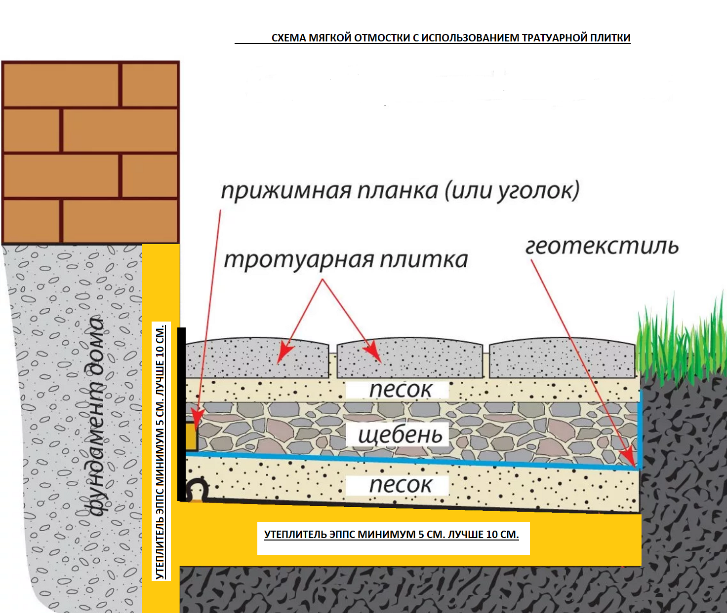 Укладка тротуарной плитки. На представленном рисунке можно ознакомиться со схемой правильной мягкой отмостки с тратуарной плиткой