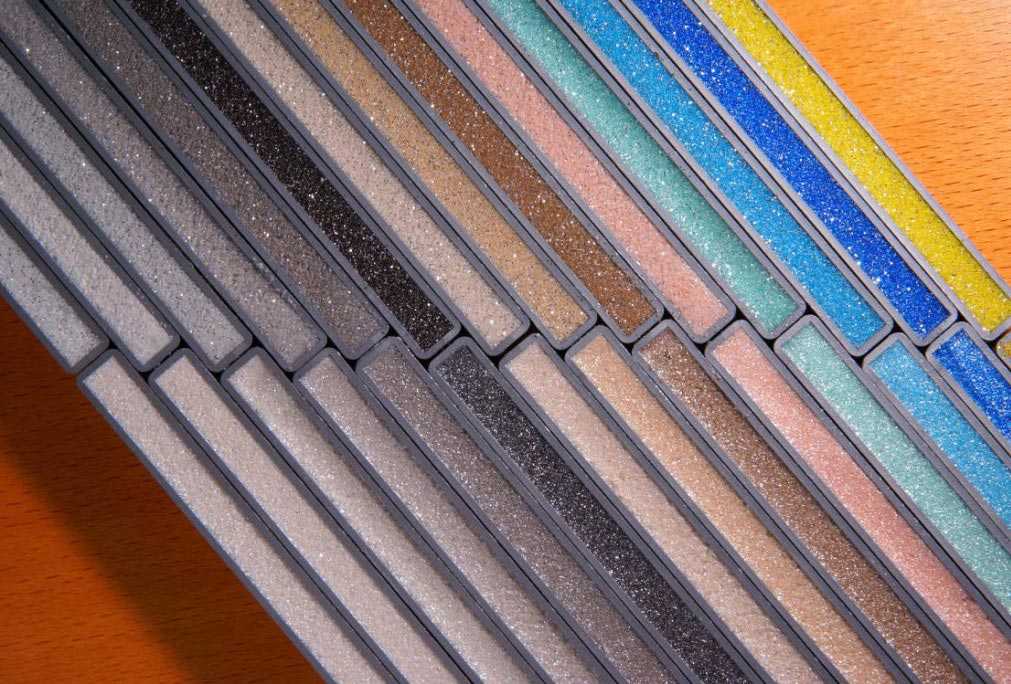 Эпоксидные смеси часто продаются с уже выбранным колером, дополнительными визуальными эффектами. Особенно красиво смотрятся полупрозрачные материалы и с блестящими включениями. Цементные затирки тоже можно приобрести в уже готовых цветовых вариациях.