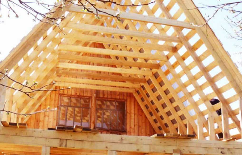Для сооружения стропил берутся доски 20х5 см длиной 6 м. Из двух досок собирается первая пара стропил и устанавливается на край каркаса. Такая же пара устанавливается с противоположной стороны. Между двумя парами стропил с двух сторон натягиваются шнуры для контроля плоскости крыши. По ним выставляются остальные стропила. Шаг между ними варьируется от 60 до 80 см в зависимости от выбора утеплителя. Для укрепления применяются деревянные ригеля сечением 20х5 см. Они скрепляют пару стропил наподобие буквы «А».