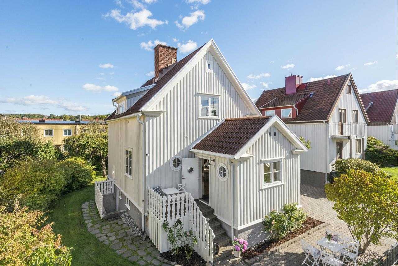 На фото экстерьер бежевого коттеджа в норвежском стиле с окнами и дверями коричневого цвета.