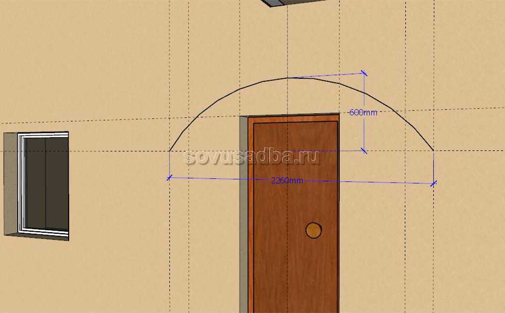 По науке, перед тем как что-либо строить, это что-то стараются нарисовать, притом делают это на листе бумаги. Но мы пошли другим путем, и начертили изгиб нашего козырька прямо на фасаде. Ну, а что? Ненужно ничего делить, отнимать или умножать. Можно снимать фактические размеры безо всяких пропорций.