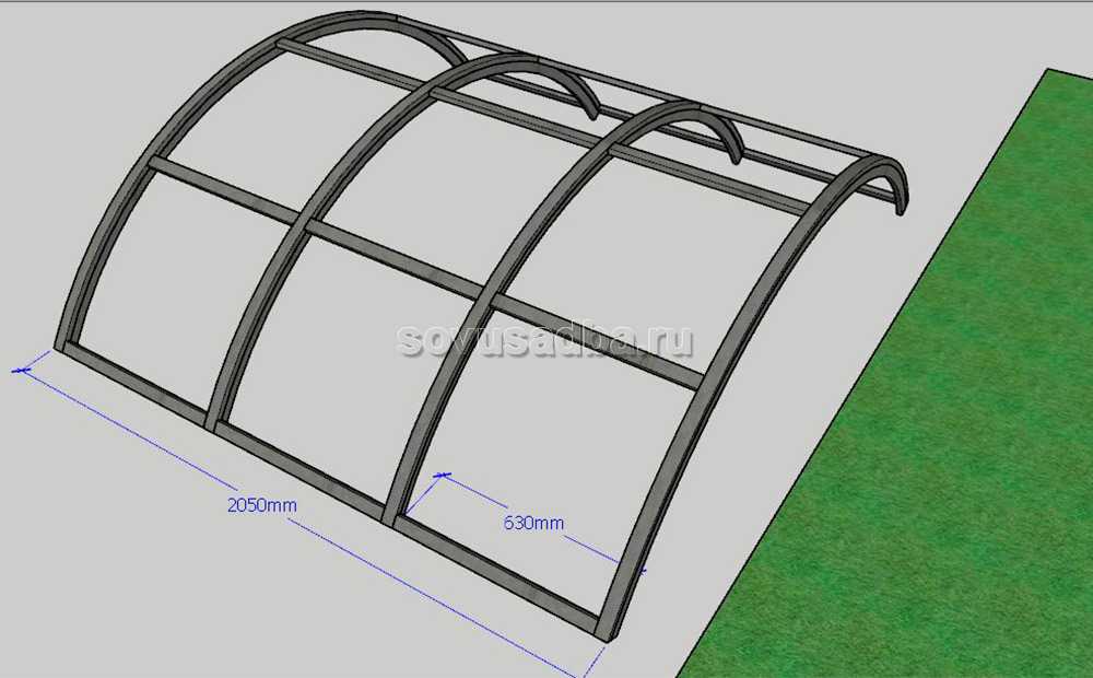 Каркас делается из металлических труб. Их режут на части нужной длины, складывают по узлам и сваривают. Готовые части сваривают уже в цельную конструкцию. После требуется зачистить швы сварки. После следует грунтовка и окрашивание, о чем было сказано выше. К монтажу полимера следует приступать только когда каркас высохнет.