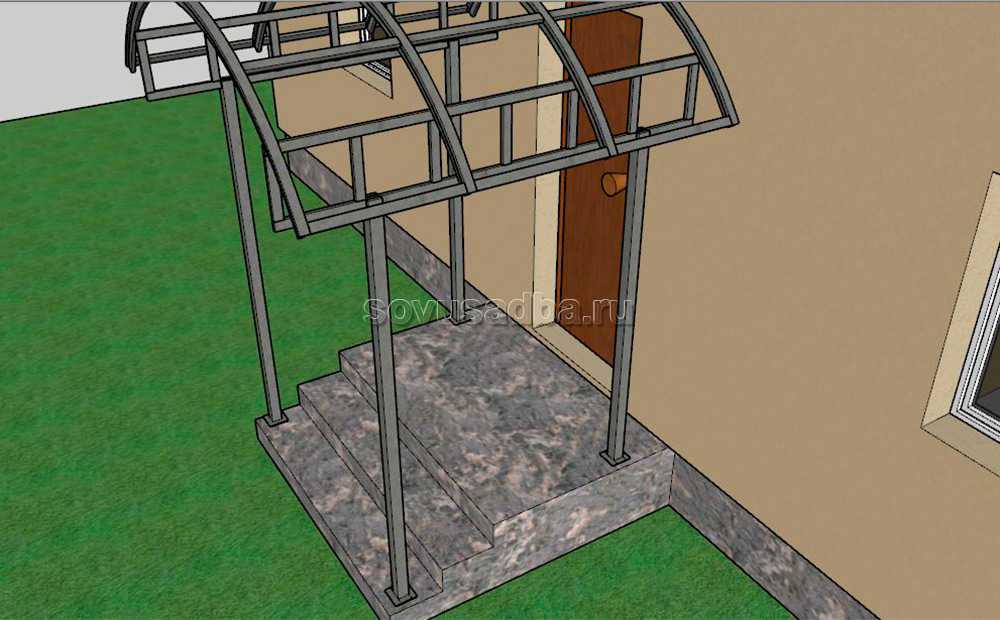 Для ее изготовления также применимы стальные трубы. Однако для формирования арочной основы необходимо изогнуть заготовки на специальном станке. Это накладывает определенные ограничения на минимальные габариты козырька. Если навес должен быть достаточно большим – можно установить дополнительные опорные колонны для увеличения площади перекрытия.