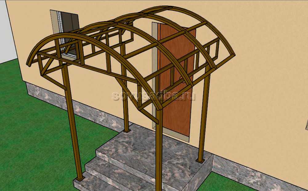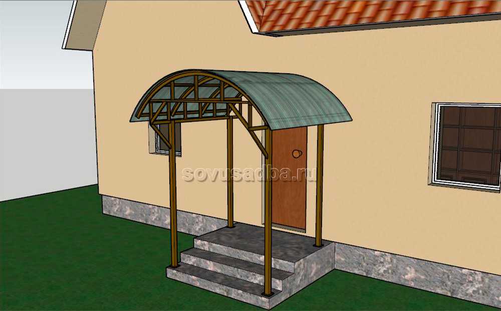 Для обеспечения максимальной зоны перекрытия рекомендуется изготовление и установка арочных козырьков. Его конструкция схожа с односкатной. Разница заключается в форме основы для установки листа поликарбоната – она имеет дуговую конфигурацию.
