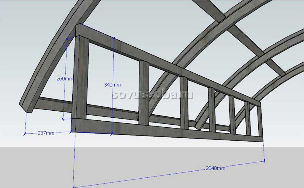 Следующей важной установкой было изготовление двух опорных ферм и соединение их с купольной частью крыльца. Если хотите повторить наш опыт, подробности найдете на следующих схемах