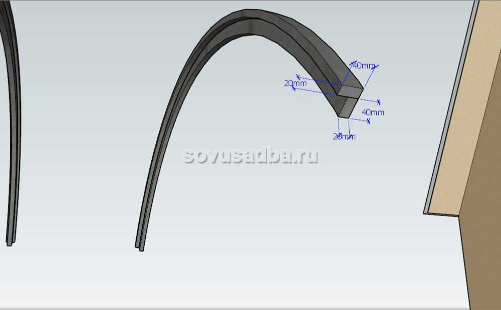 Вот как раз по этим размерам мы и заказали на металлобазе 4 одинаковых дуги из профиля сечением 40×20 мм. Работа обошлась в 20% от стоимости металла. То есть мы не сильно разорились. Кроме того был с запасом приобретен и ровный профиль того же сечения. Брали, на все деньги. Впереди была еще постройка забора, так что опасаться остатков было нечего.