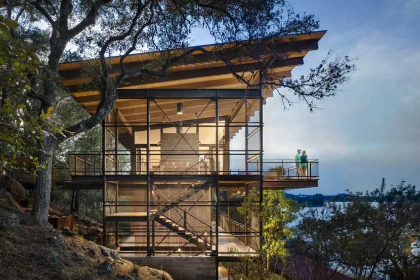 Комнаты обладают внушительной высотой потолков, а плоская по форме крыша дает возможность использовать каждый сантиметр площади с пользой. Ступени обрамляются вмонтированной подсветкой, из-за чего строение напоминает футуристичный космический корабль.