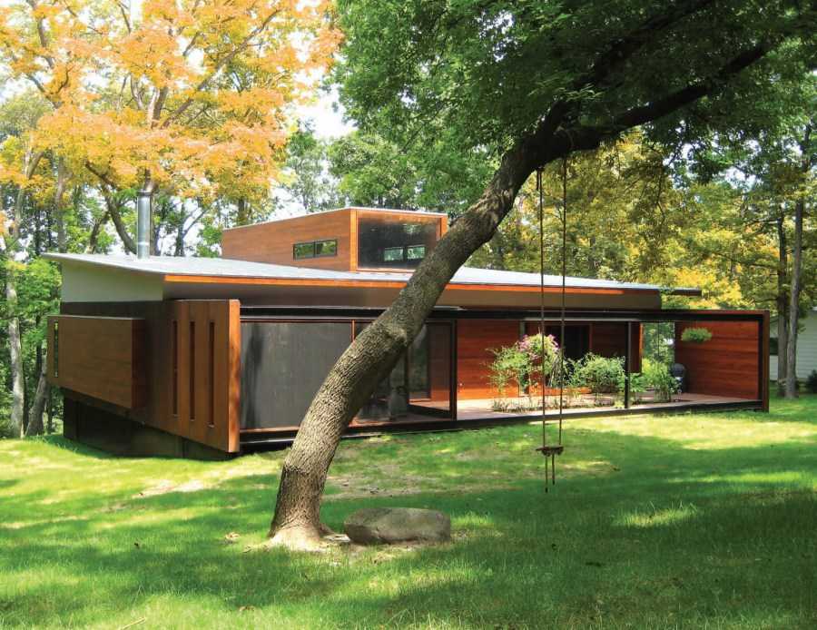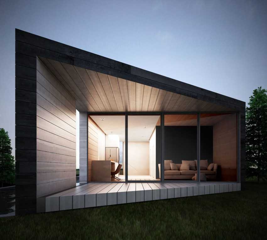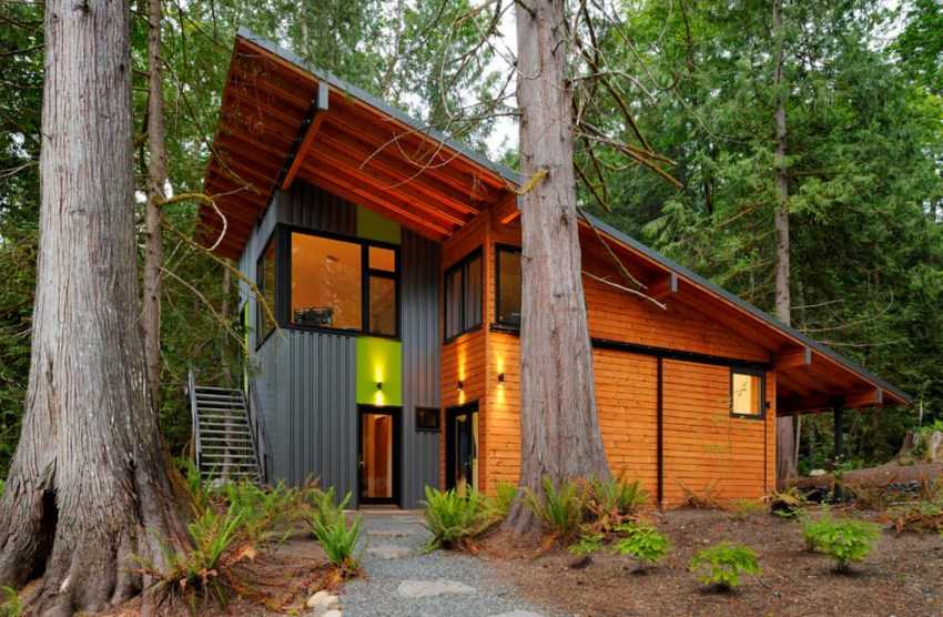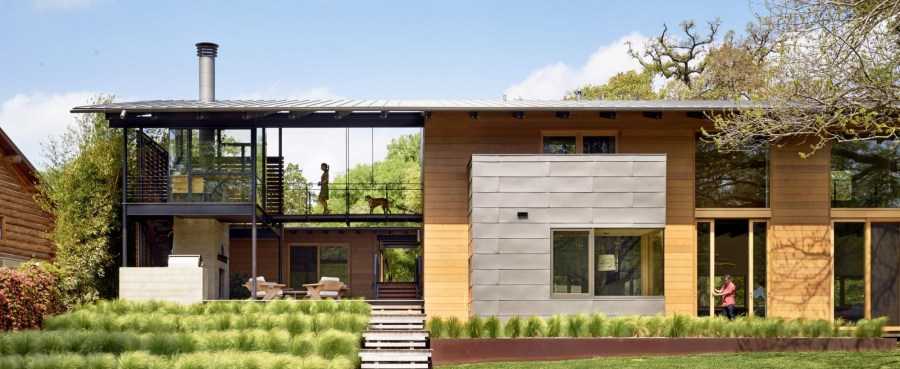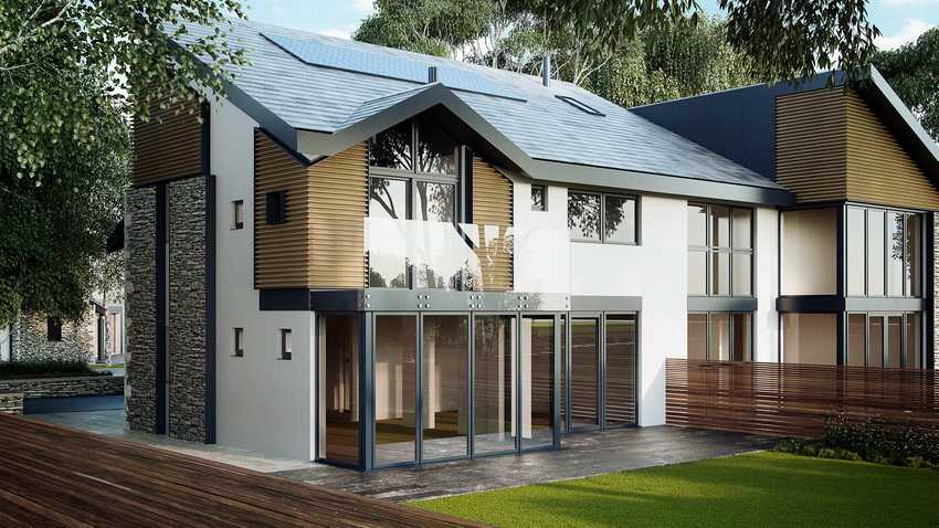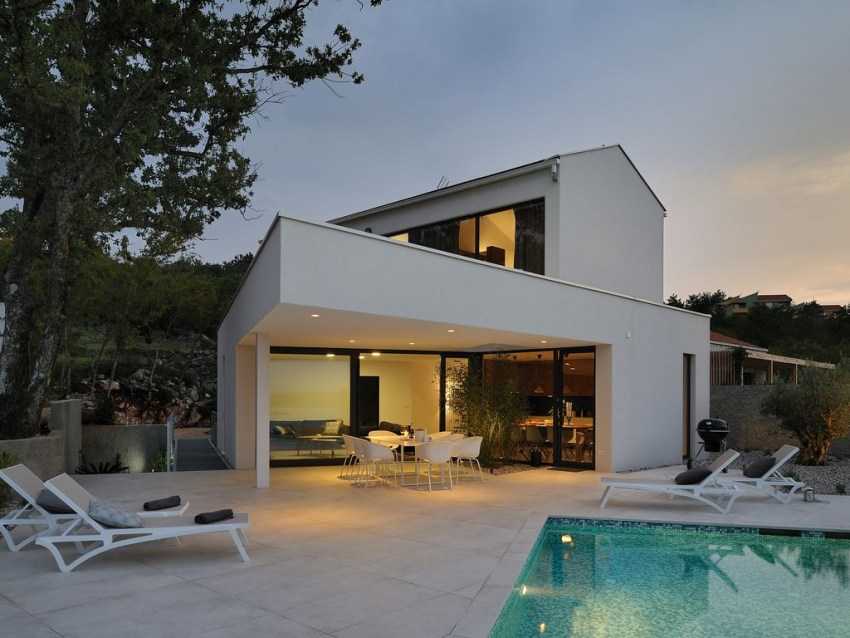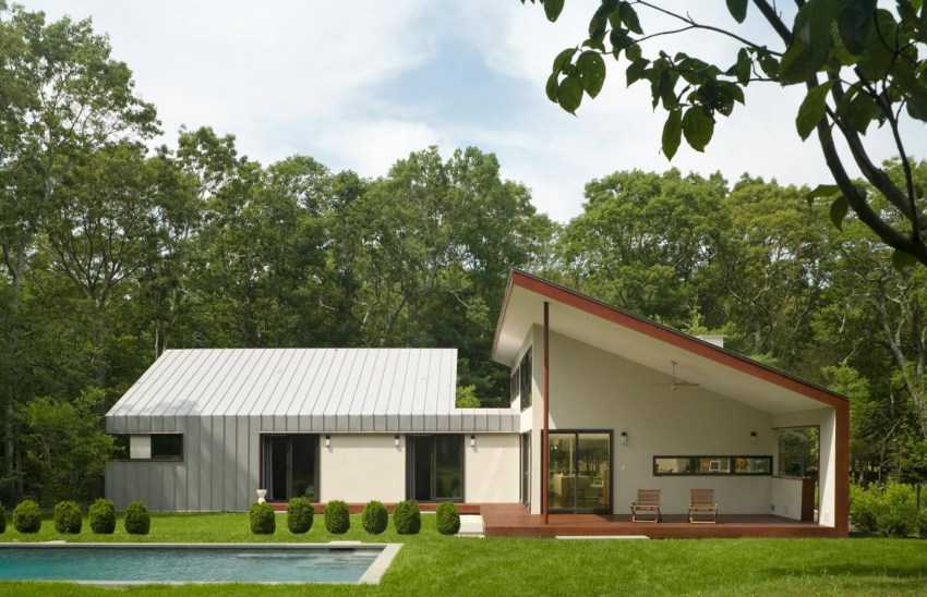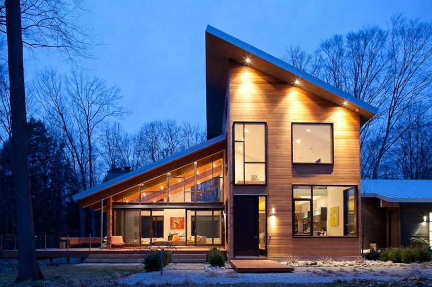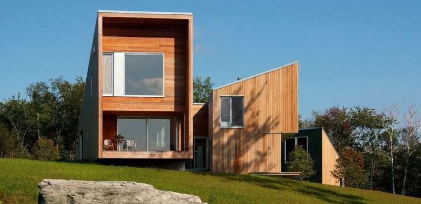 Дома минималистов и любителей хай-тека выделяются своими нестандартными формами. Они выполнены в виде куба, имеют стеклянные стены и панорамные стеклопакеты. Стены этих зданий обшивают современными искусственными материалами.