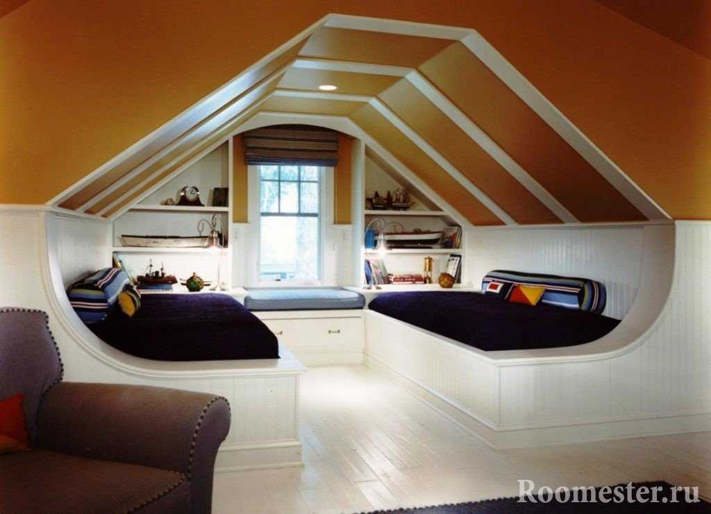 В мансардном помещении можно обустроить спортивный зал, спальню, кабинет, гардеробную, гостиную. При организации спального места располагайте кровать у глухой стены на безопасном расстоянии до потолка. В мансардной спальне не стоит устанавливать шкафы, отдайте предпочтение вместительным комодам.