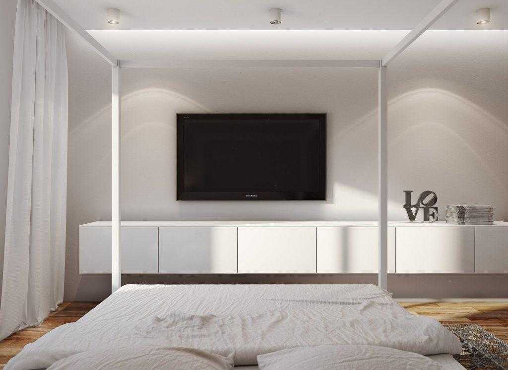 Чаще всего ТВ-панели в спальне стараются подвесить прямо перед кроватью, откуда в положении лежа все будет видно. Здесь основные правила поиска правильного места таковы: