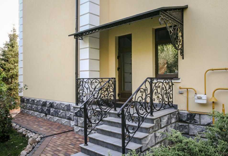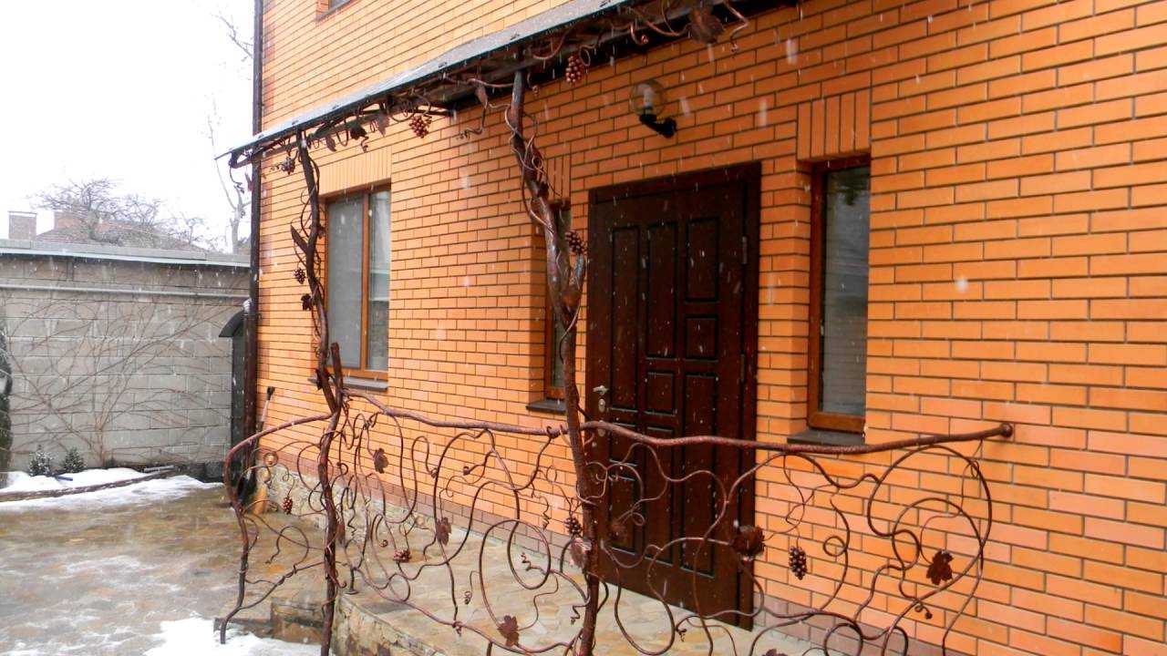 Роскошь и презентабельность — вот главное отличие кованых козырьков и навесов над крыльцом частного дома своими руками. Кованые декоративные конструкции становятся центральным элементом экстерьера. Кованые изделия отличаются высокой стоимостью, поэтому при желании можно сделать козырек с элементами ковки, отлично сочетающиеся с поликарбонатом, пластиком, металлочерепицей и листовым металлом.