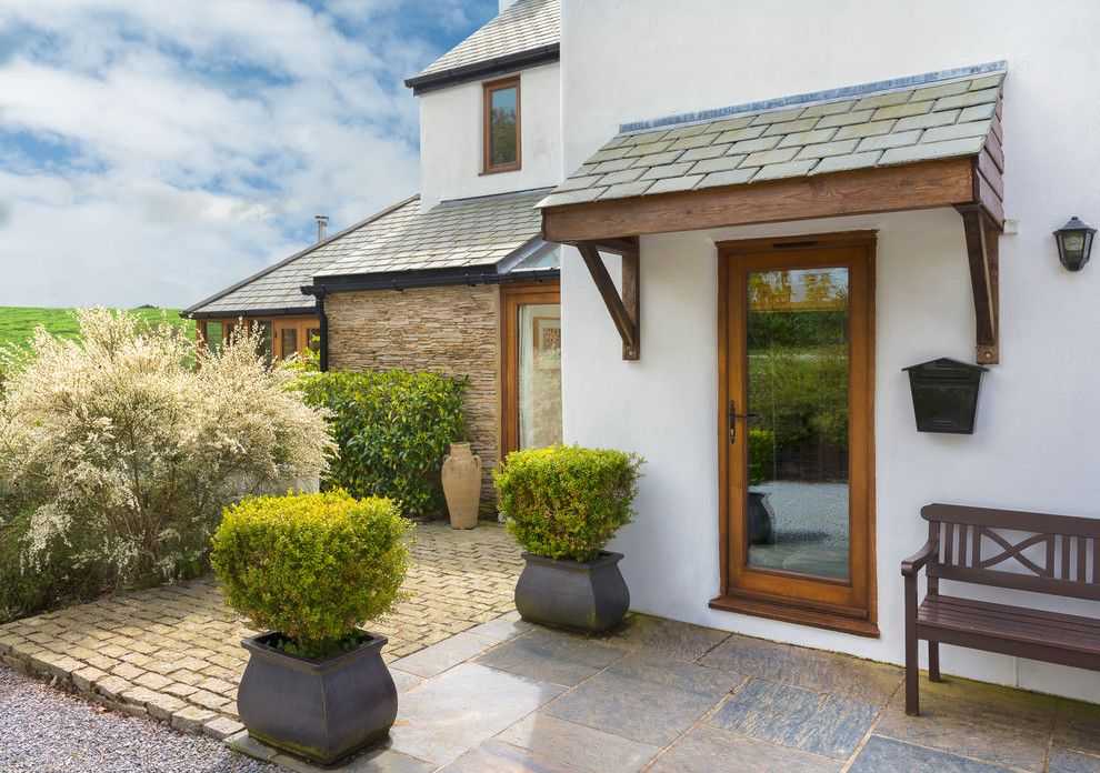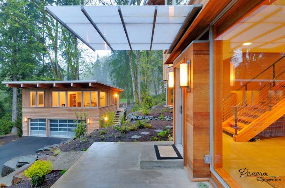 Навесы в виде козырька применяют для укрытия прилегающей территории от плохих погодных условий. Это прекрасный вариант для защиты ступеней и порога от замерзания зимой, что поможет исключить падения и травмы.