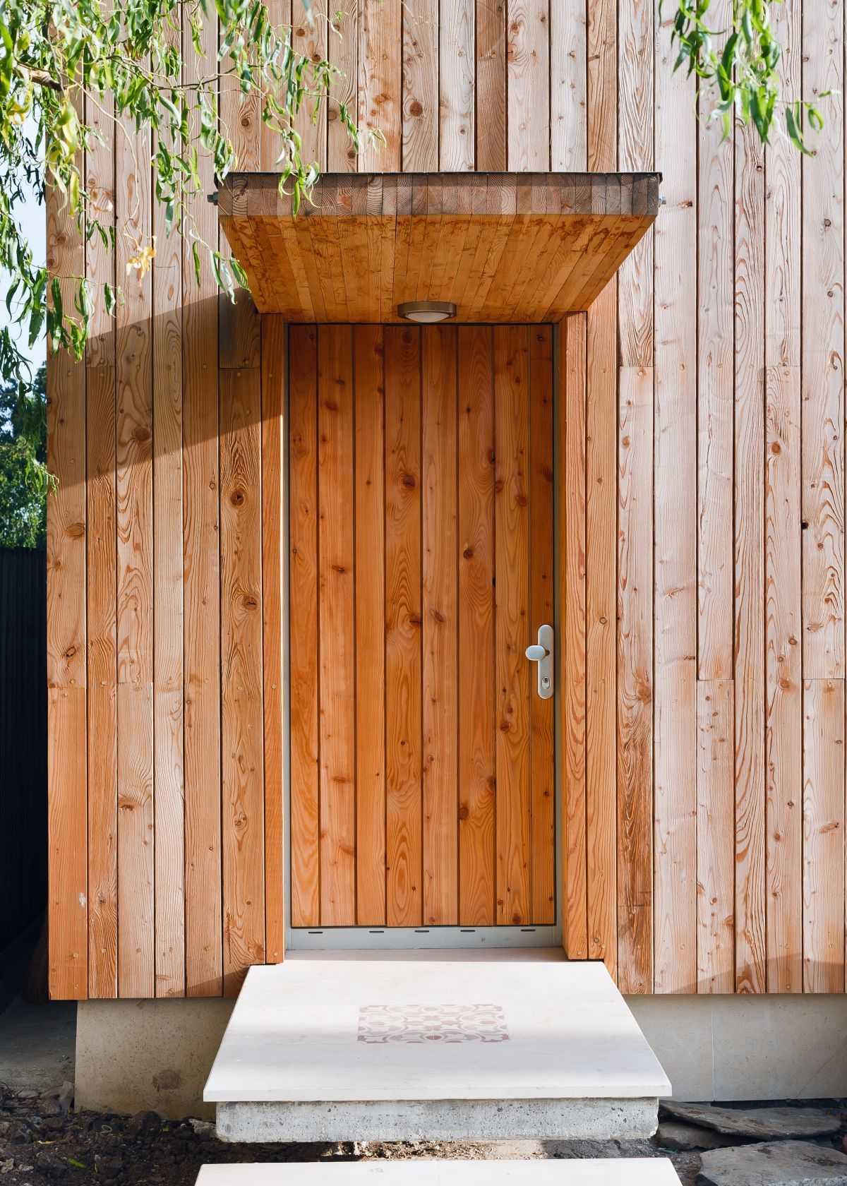 Деревянный навес над дверью используется для оформления домов, построенных из бревен, бруса или отделанных под данные материалы панелями или плитами. Хорошо смотрятся деревянные конструкции на кирпичных и каменных зданиях. Материал прост в обработке, экологически безопасен и имеет небольшой вес. Недостаток состоит в том, что органика подвержена гниению, горюча, в ней могут развиться грибок и плесень или поселиться насекомые. Брус и доски необходимо регулярно обрабатывать специальными жидкостями.