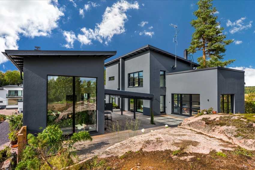 С помощью проекции пространство было расширено за край скалы. Гостиная словно посреди природы. Вы также можете насладиться природой на большой крытой террасе площадью 38 м². Одноэтажные финские деревянные дома очень часто имеют такие характерные элементы, как панорамные окна и максимальная открытость пространства.