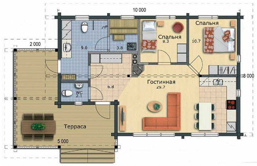 Пример планировки одноэтажного дома с террасой для небольшой семьи – конструкция террасы тоже должна учитываться при проектировании фундаментаИсточник pestovodoma.ru