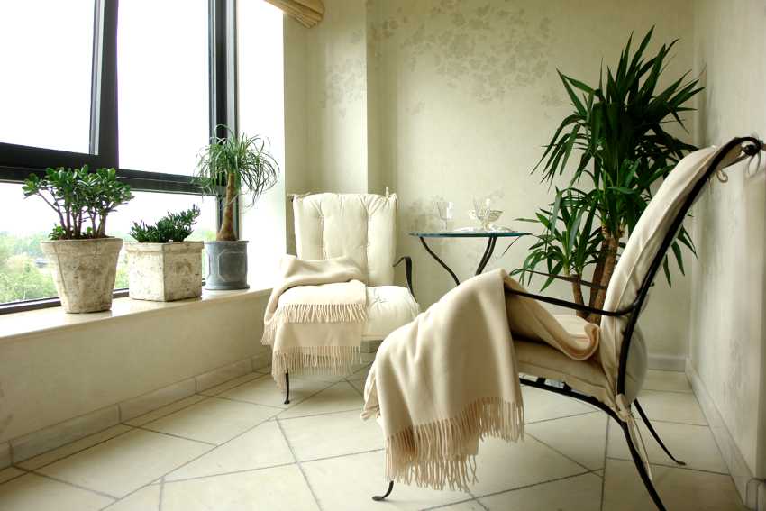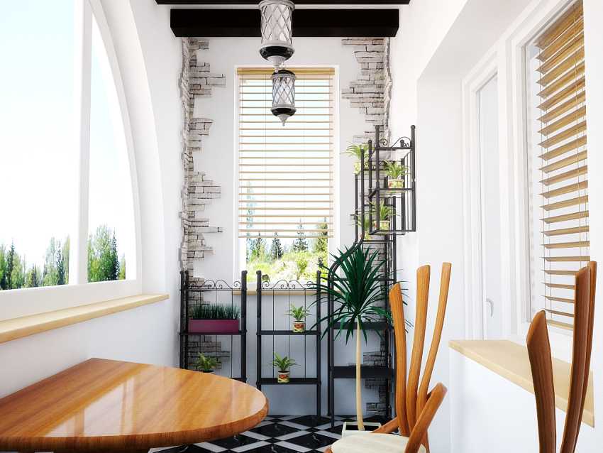 Также для оформления важен свет. Правильное освещение создается системой торшеров, светильников и ламп. В больших балконах устанавливаются люстры.