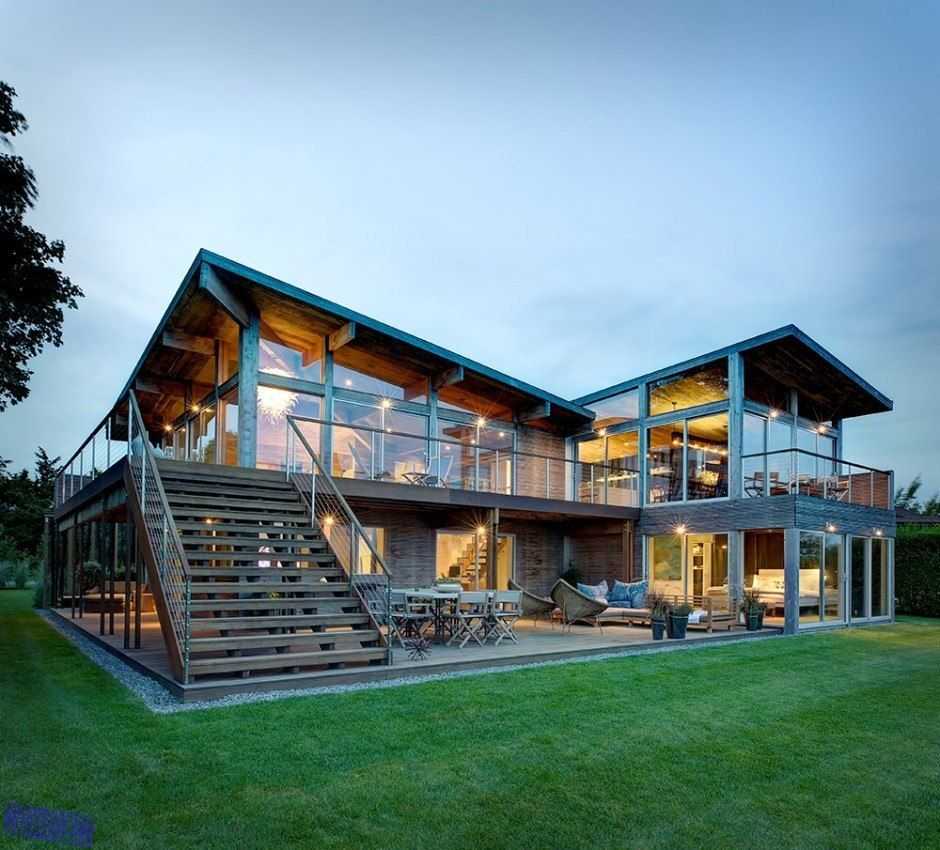 Оригинальный, а самое главное – стильный и современный дом, относящийся к стилю хай-тек. Огромные, во всю стену, панорамные окна, зал для занятия тяжёлой атлетикой или фитнесом на первом этаже. Преимущества планировки двухэтажного дома в следующем: