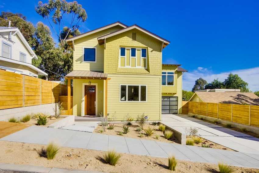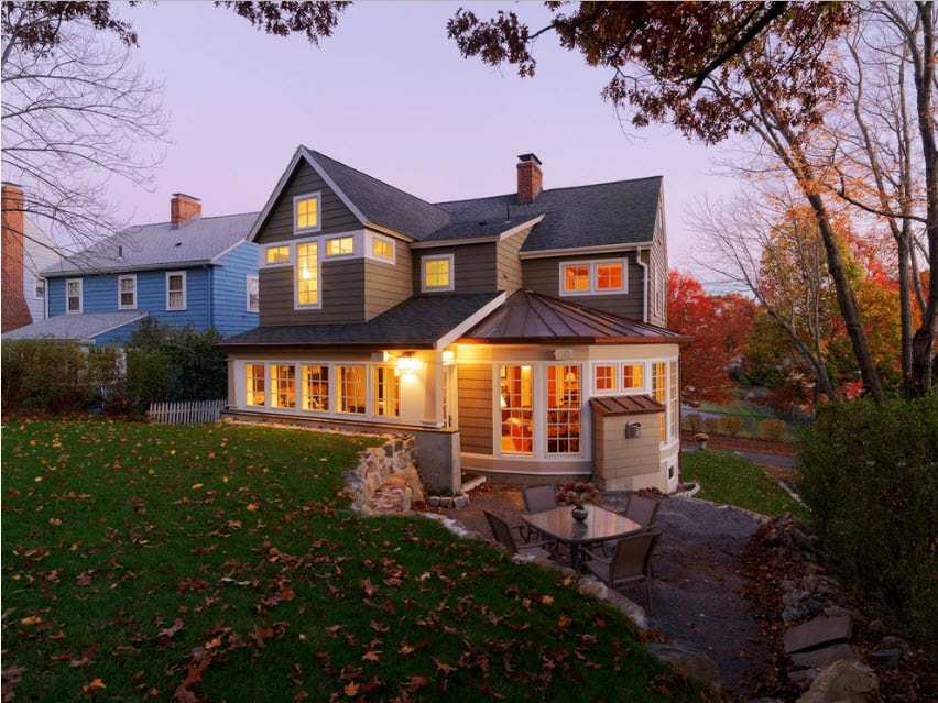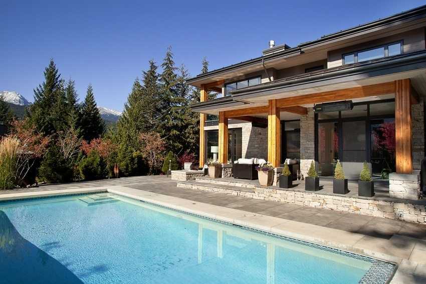 Двухэтажный дом с пристроенным навесом и бассейном на заднем дворе