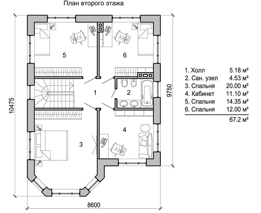 Проблема первого этажа решается благодаря увеличившемуся санузлу на втором. На 5,8 м2 уже удастся разместить небольшую ванную и остальную сантехнику. Оригинальным может показаться решение второго кабинета с аналогичными характеристиками. Вы скажете, — «Для чего на втором этаже 2 туалета!». Ответ очевиден – дети. Они растут по одному принципу: захотел один, побежал и второй. Поэтому на данном примере планировки эта проблема устранена.