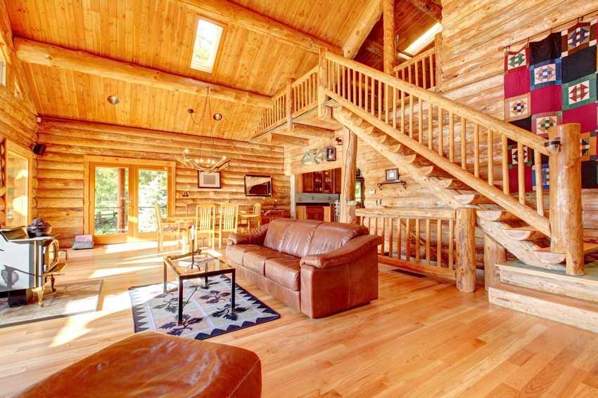 Внутреннее убранство двухэтажного дома, возведенного из бревен
